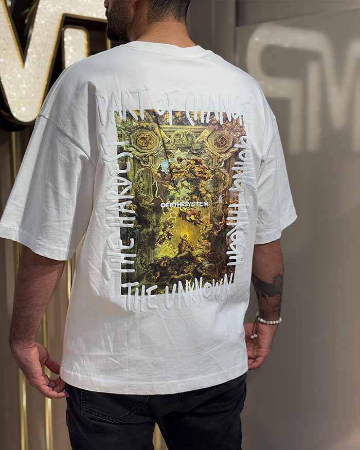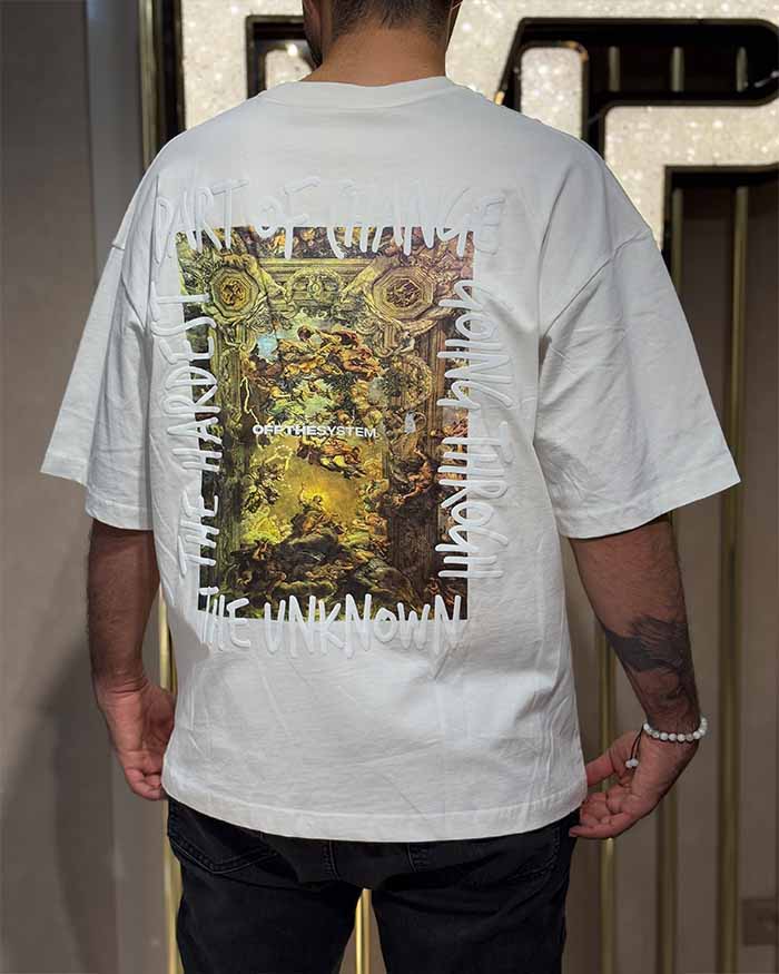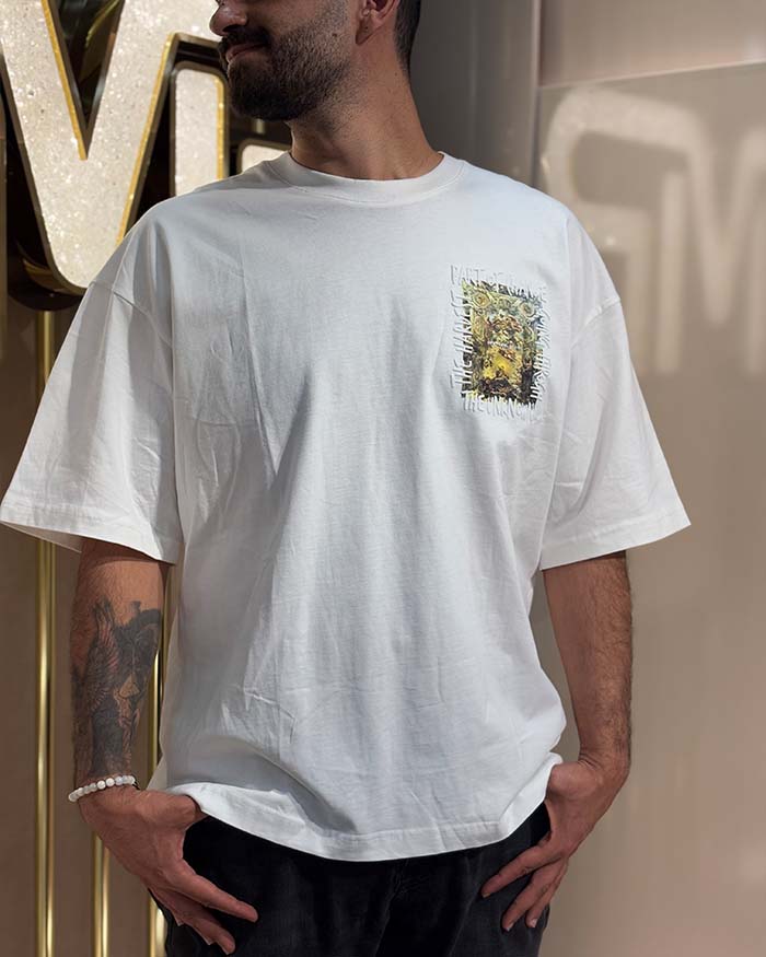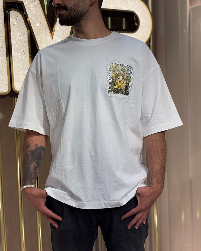 اگر به تیشرتهای هنری با استایل شهری علاقهمندید، این مدل انتخاب ایدهآل است. چاپ پشت با نقاشی کلاسیک و تایپوگرافی معاصر، ظاهری چشمگیر میسازد. الیاف پنبهای خنک و الگوی ریلکس فیت، راحتی طولانیمدت را تضمین میکند. برای یک استریتاستایل تمیز، با جین تیره یا کارگو ست کنید.