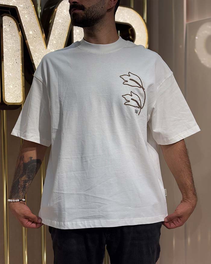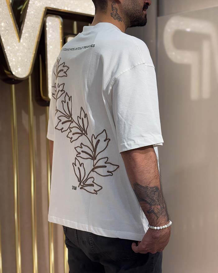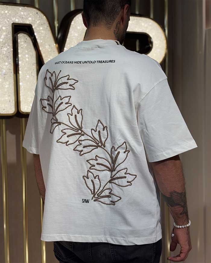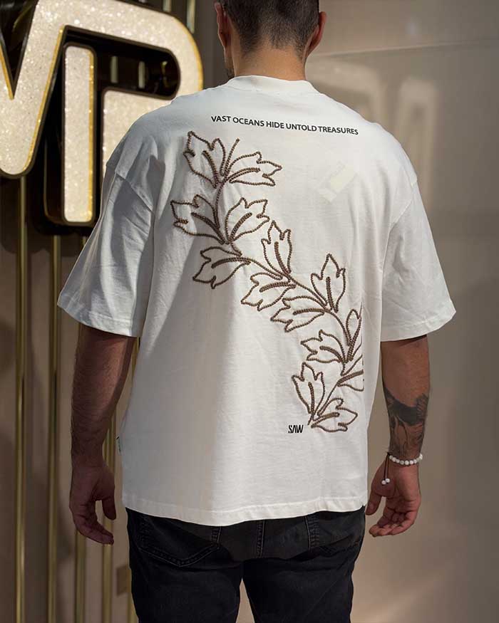 تی‌شرت اورسایز سفید گلدوزی برگ
