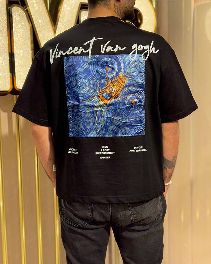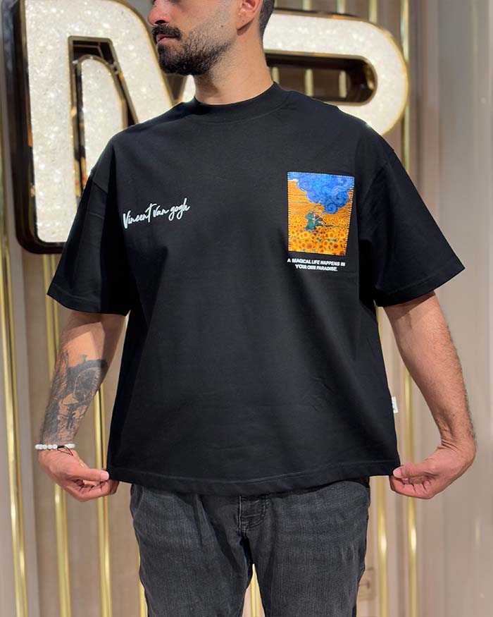 این تیشرت اورسایز مشکی با چاپ هنری Vincent van Gogh ظاهری متفاوت و چشمگیر میسازد. الیاف پنبهای گردش هوای عالی را فراهم میکنند و الگوی ریلکس فیت، راحتی تمامروزه را تضمین میکند. با جین تیره یا کارگو و کتونی سفید ست کنید تا یک استریتفشن مینیمال و حرفهای داشته باشید.