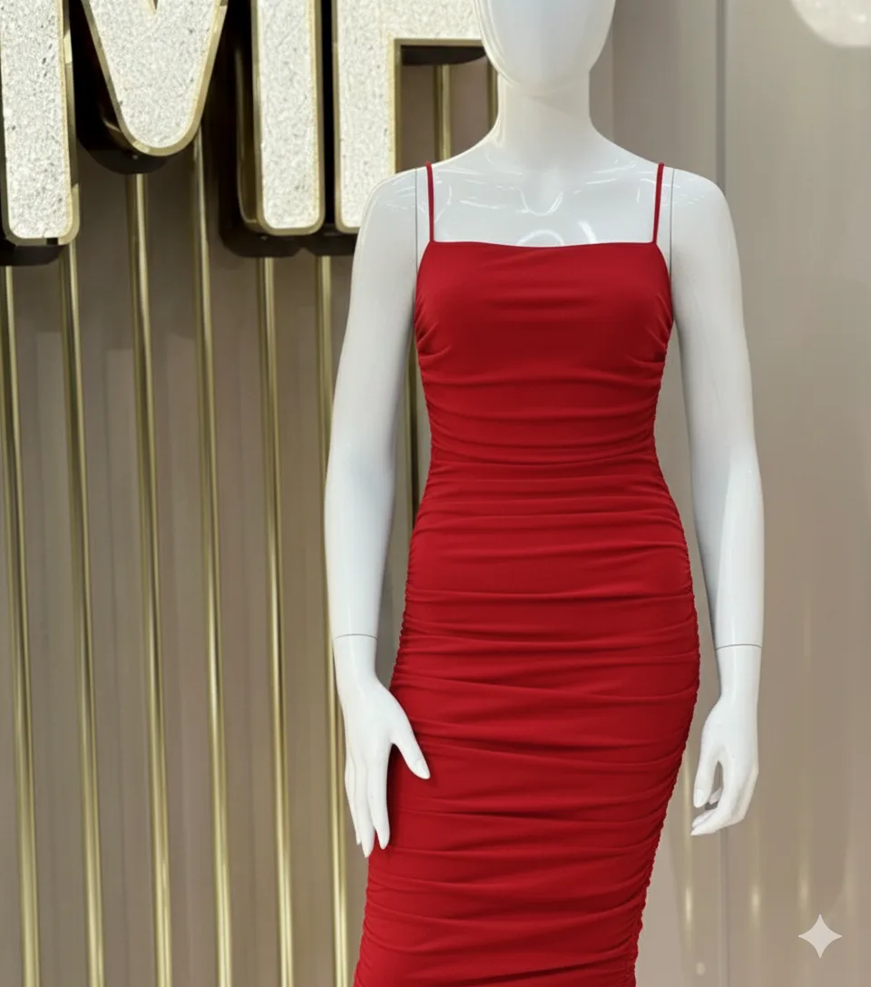 لباس شب زنانه با بند نازک قرمز و دامن میدی